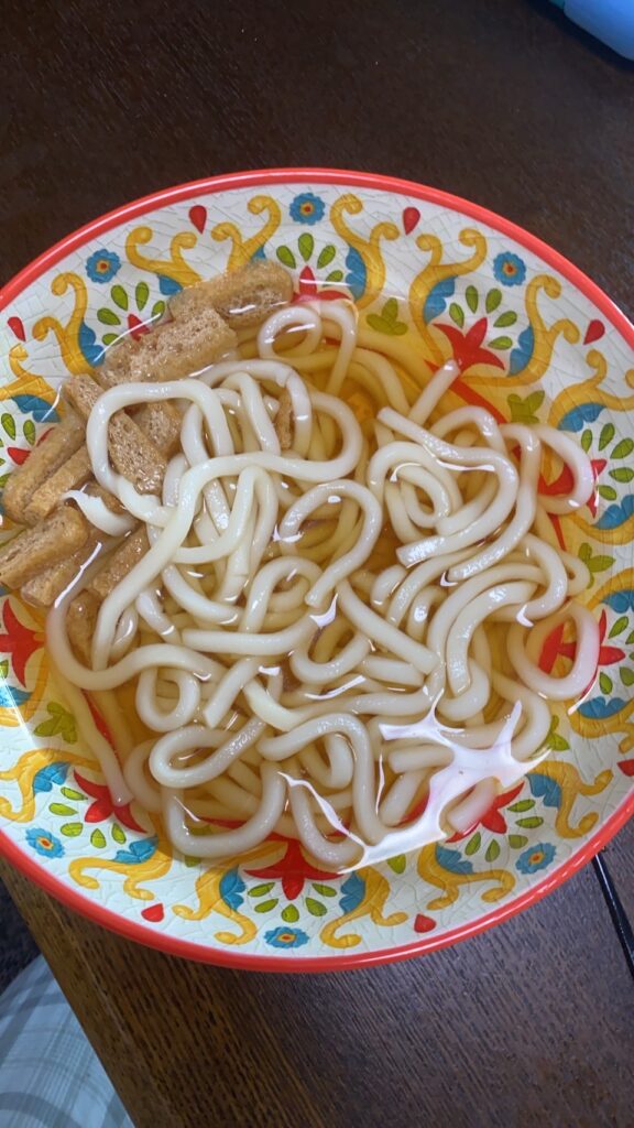 今まではお昼を作り置きしていたのですが「自分で何か作る?」と提案してみると「やる!」とのこと。冷蔵庫にちょうど「ゆでうどん」がありました。軽く湯がいて、めんつゆを用意するだけではありますが、料理初心者がチャレンジするには手頃なメニューです。ちょうど良く、味付きの刻み油揚げもありました。